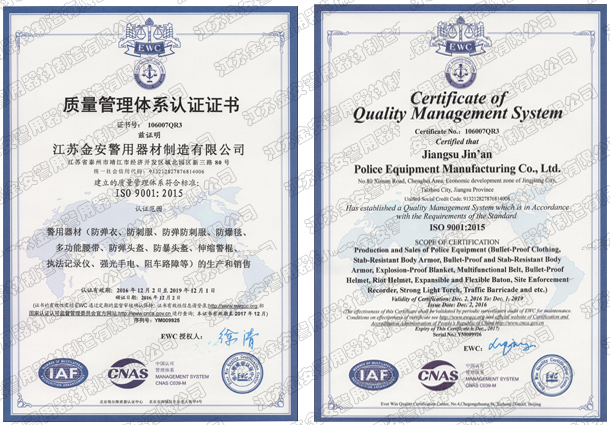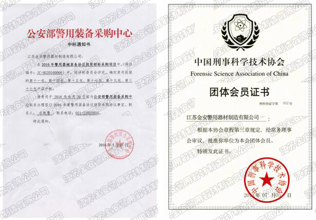 第一批新型單警裝備定點生產企業 公安部警用裝備采購中心協議供貨單位 公安部防彈防刺服生產定點企業 江蘇省公安廳防彈衣入圍企業 江蘇警用裝備行業協會會員單位 中國刑事科學技術協會團隊會員單位 中國安全防范產品行業協會會員單位 靖江市保安器材行業協會常務理事單位 全國警用裝備標準化技術委員會通訊委員 江蘇金安警用器材制造有限公司始創于九十年代初,公安部防彈防刺服生產定點企業、公安部警用裝備采購中心2..